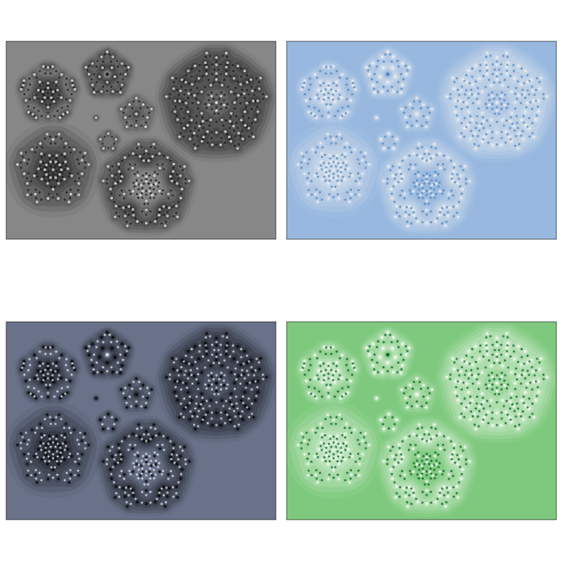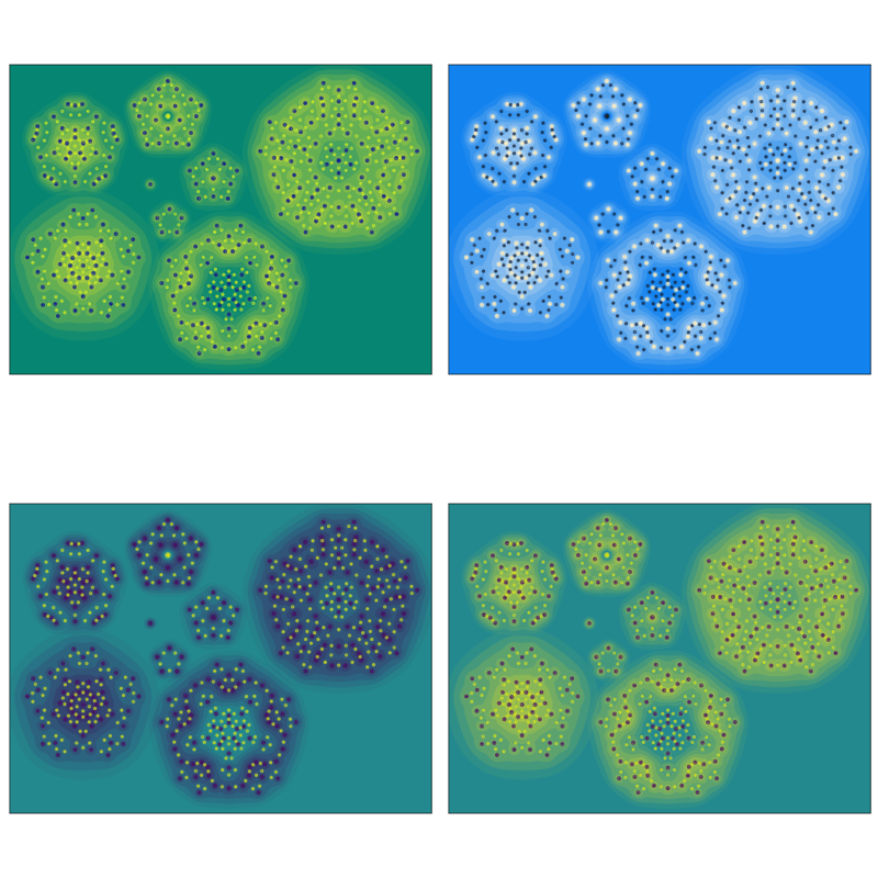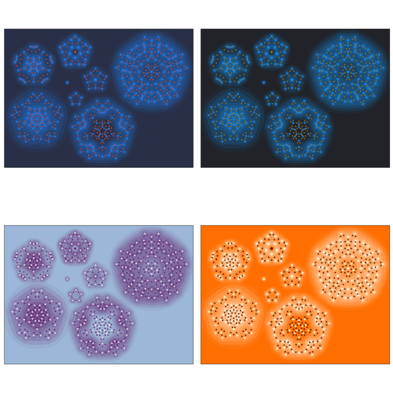 As a fun aside — we didn't only produce one image. We made many, and we made many configurations.2 2I should give an additional thanks to Miles, who spent a lot of time hand-tuning the particular parameters and contours in the final image. In my work on visualizing modular forms, I developed a few techniques for color selection from matplotlib style colormaps, and produced several variants. I've collected a few of these below.