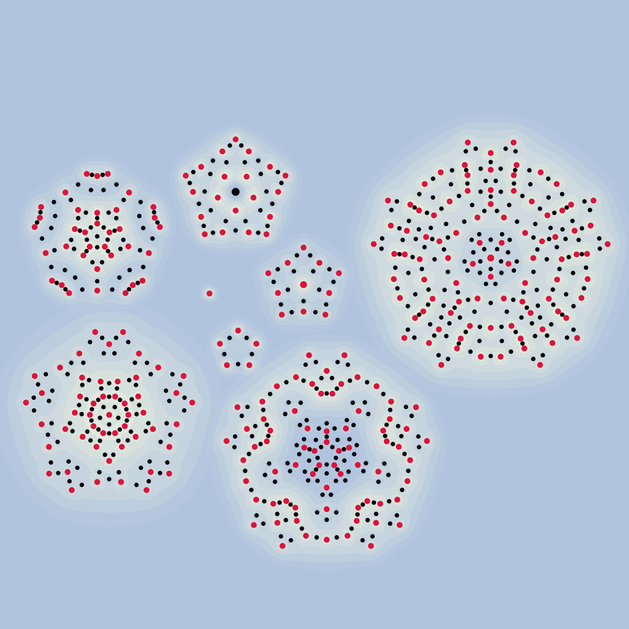 This is the situation depicted on the cover — begin with a simple configuration and iterate the process. The spiral shape was added afterwards and doesn't describe underlying mathematical phenomena. The different colors of each vortex shows whether that vortex is a sink or a source, essentially.