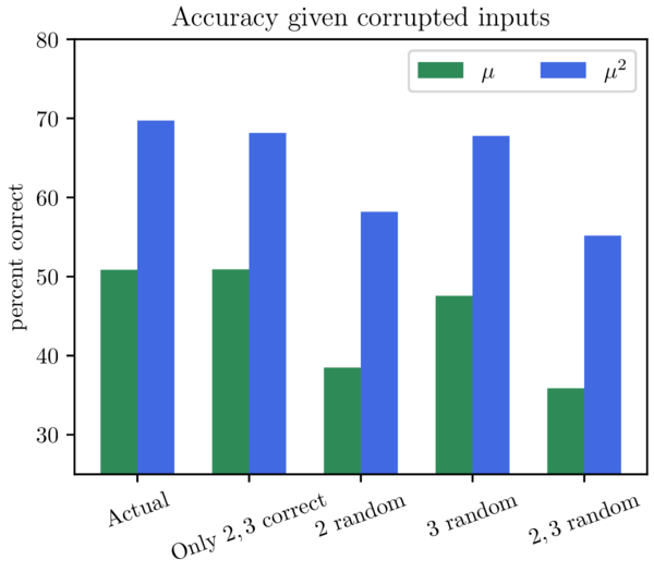 The left is the actual data with no corruption. Just beside it is the same model, but fed data where all but $(n \bmod 2, n \bmod 3)$ have been corrupted (and replaced by random inputs). Notice that the behavior is very similar, with almost no change in the quality of predictions for $\mu(n)$ and only a small decrease in predictive power for $\mu^2(n)$.