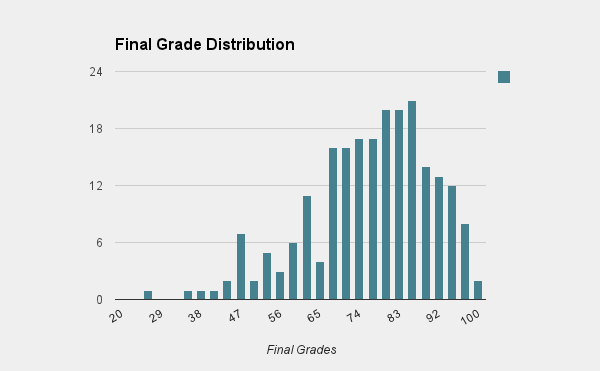 Many times throughout the course, I estimated that an A would be a bit above half a standard deviation above mean, and passing would be roughly one standard deviation below mean, and the B/C line would be roughly in the middle, but harder to say. So the going heuristics going into the final were an A being somewhere between an 82 and an 85, a B being somewhere around 72, and passing to be somewhere around 60.