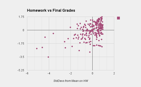 In contrast, this graphic displays standard deviations compared to mean of HW (horizontal) vs. final grade (vertical). This is a lousy correlation (the correlation coefficient is about .44, which is a very weak correlation). This doesn't surprise me, since