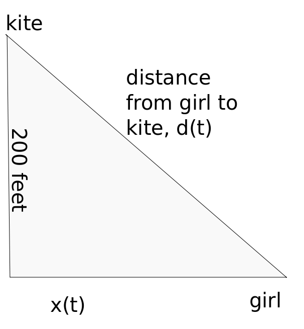 A girl flies a kite that stays a constant 200 feet above the ground. The wind carries it away from her at 20 feet per second. We were first to draw a picture.