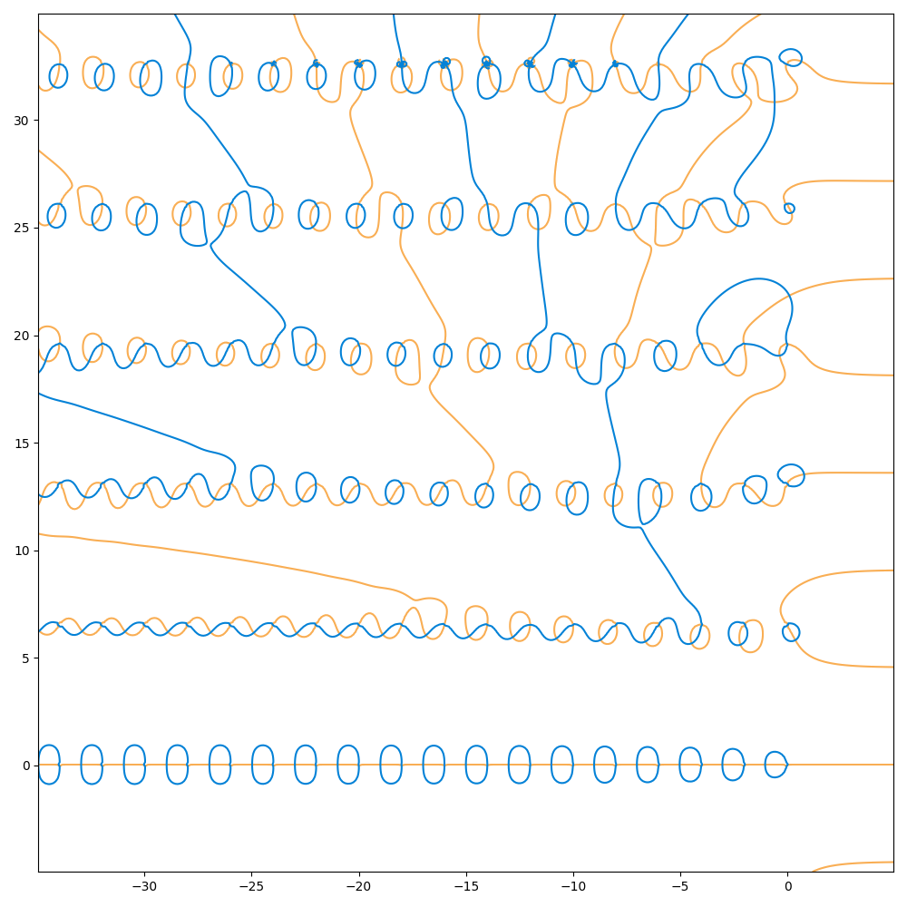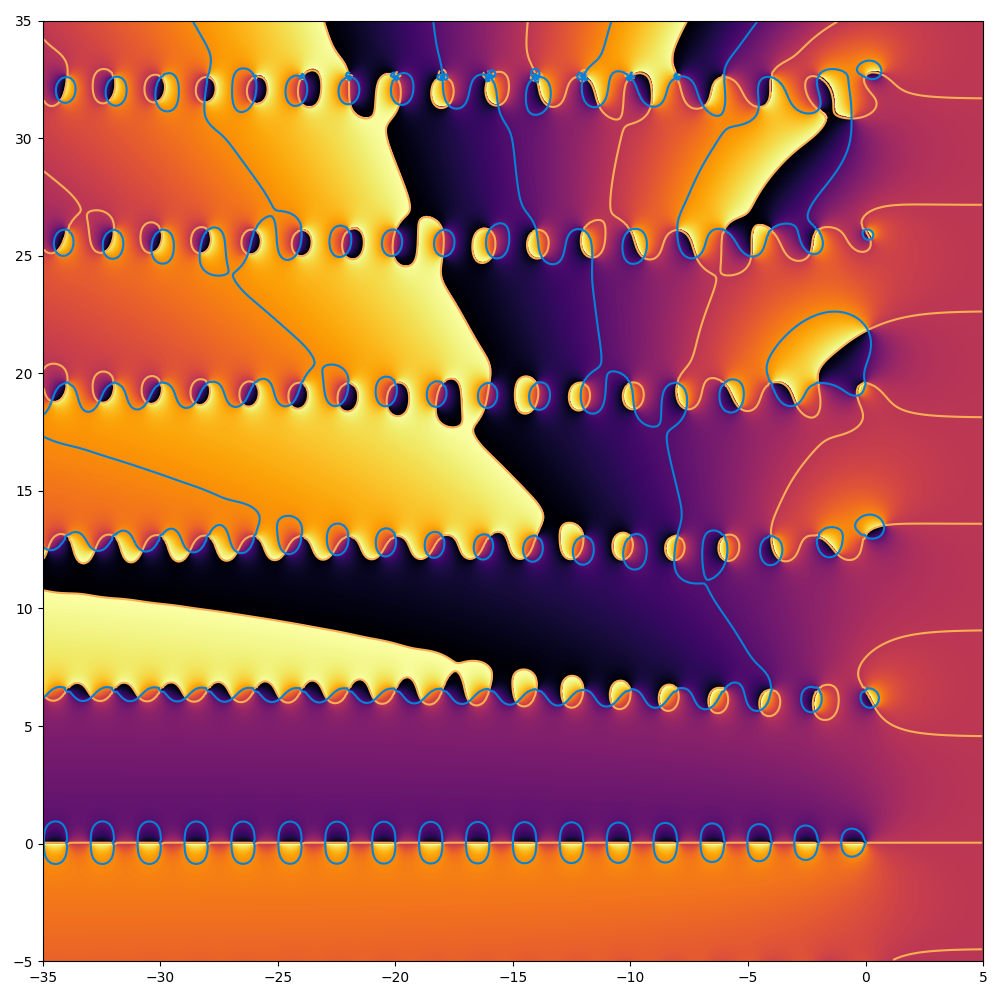 I chose to plot in the rectangle with opposite vertices $-35-5i$ and $5 + 35i$. The aspect ratio is $1$ because I almost always want my aspect ratio to be $1$. The odd Fibonacci zeta function $Z(s)$ is rather boring for $\Re s > 0$ and antisymmetric over the real axis, so it's not worth including too much in those directions.
