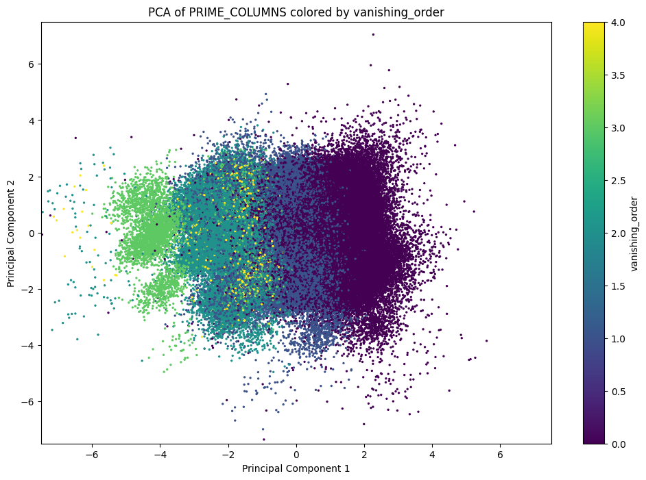 This has computed a principal component analysis, and in addition we've populated a small dataframe with data from the two most important components of the PCA. We can plot these components, coloring points based on their vanishing order. One such plot (omitting rank $4$) appears in our paper.