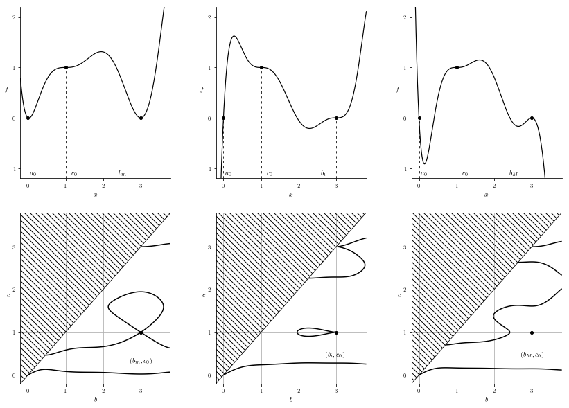 The three graphs along the bottom are in $(b, c)$ space and present all mean value abscissa for each $b$. This is not a function, but the local structure of the graphs are interesting and visually distinct.
