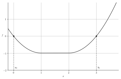 This figure has graphs of three functions along the top. In each graph, the interval $[0, 3]$ is considered in the mean value theorem, and the point $c_0 = 1$ is a mean value abscissa. In each, we also have $f''(c_0) = 0$, and the point is that the behavior of $f''(b_0)$ has a large impact on the nature of the implicit functions.