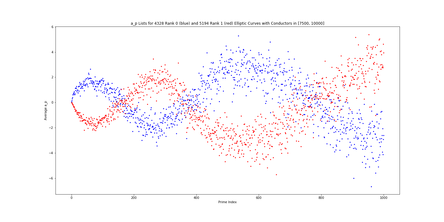 Each blue point in this image comes from the average size of $a_p(E)$ over all elliptic curves of rank $0$ (which should account for $100$ percent of elliptic curves with positive root number) whose conductor is in $[7500, 10000]$. We see, for example, that coefficients $a_p(E)$ at small primes tend to positively correlate with the root number. But at certain thresholds this reverses to negative correlation.