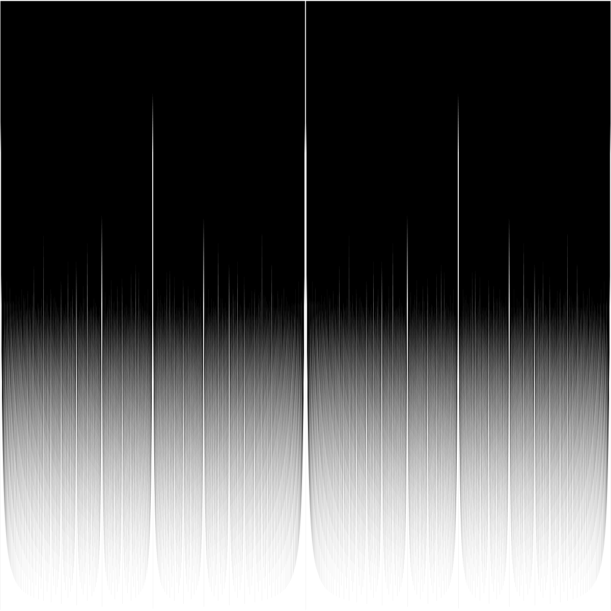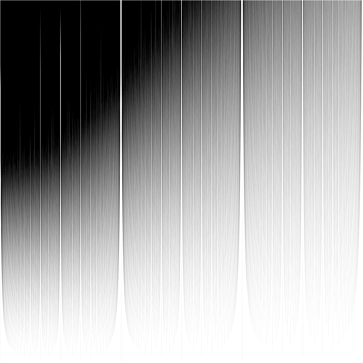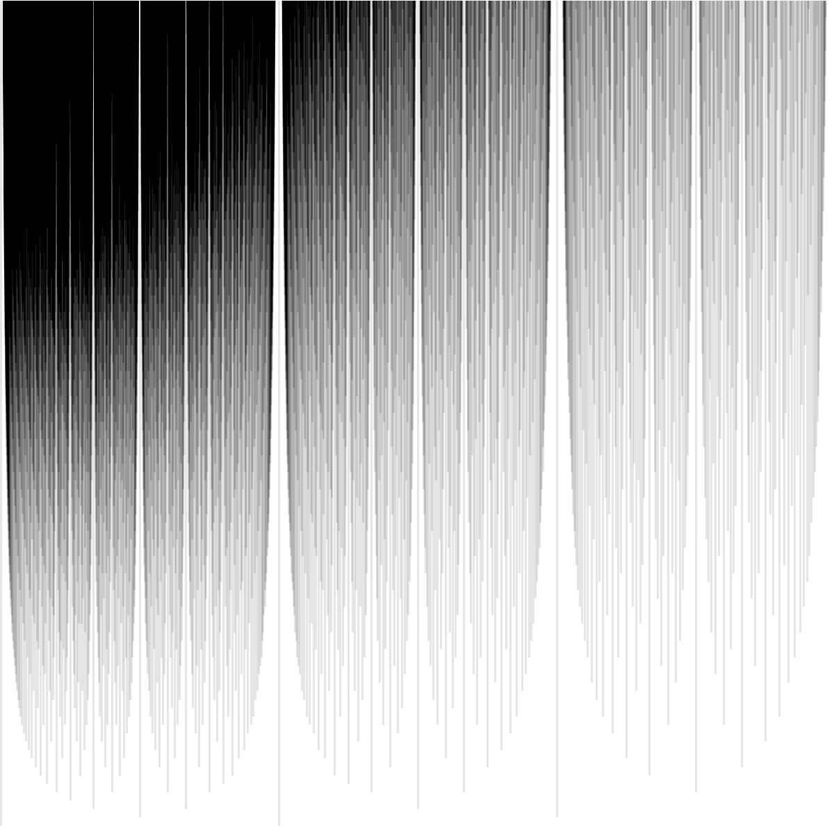 We now make a set of related images. In the images that follow, we extend each line from a point $(q, h(q))$ upwards. The effect is that at any designated height $H$, the horizontal line through $h(q) = H$ will include points whose heights are bounded above by $H$. To indicate the density of lines, we use shades of grey. The darker the line, the more rational points.