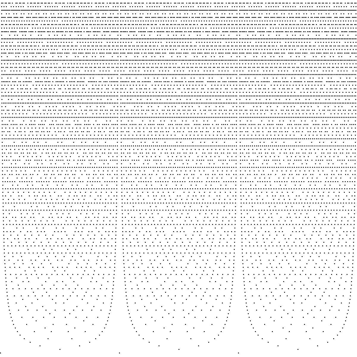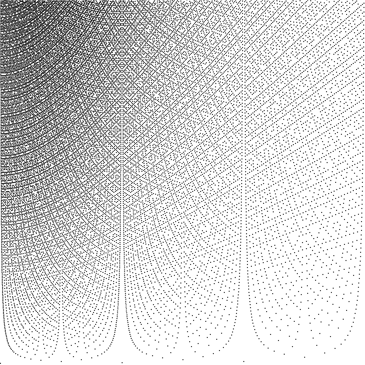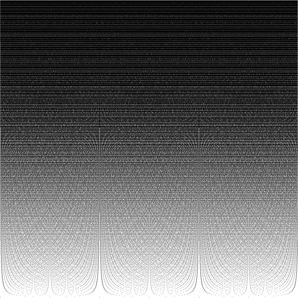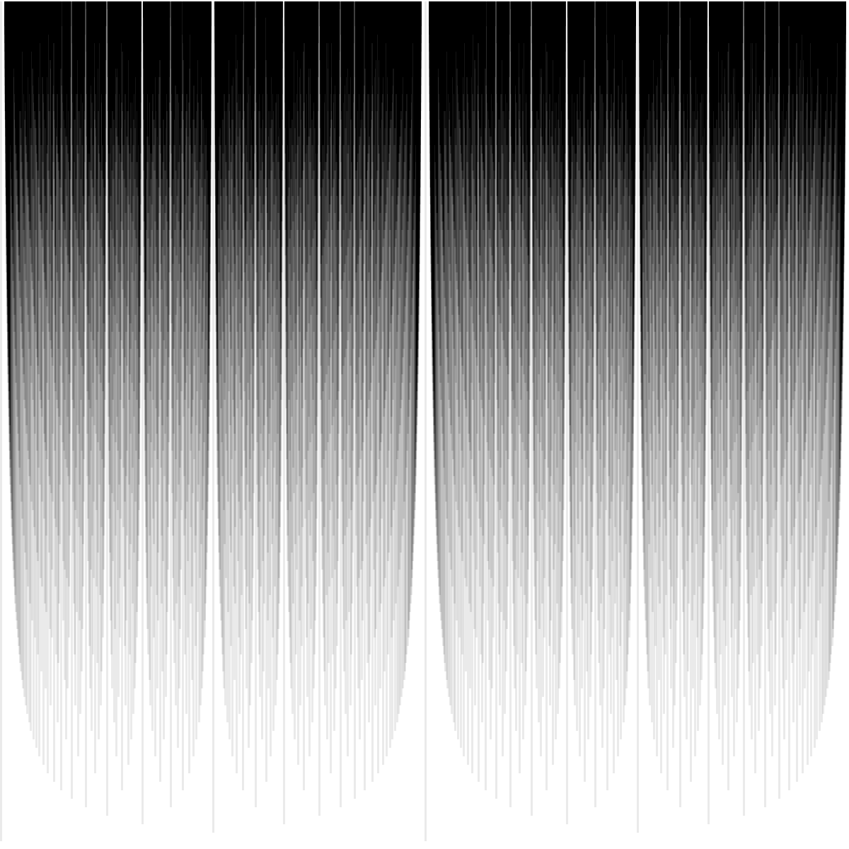 We now make a set of related images. In the images that follow, we extend each line from a point $(q, h(q))$ upwards. The effect is that at any designated height $H$, the horizontal line through $h(q) = H$ will include points whose heights are bounded above by $H$. To indicate the density of lines, we use shades of grey. The darker the line, the more rational points.